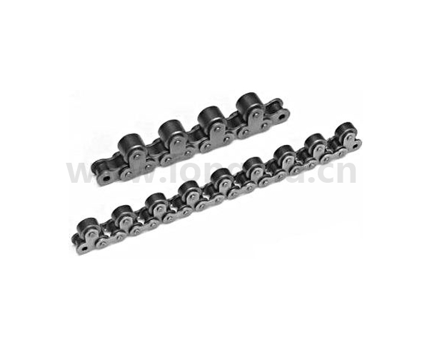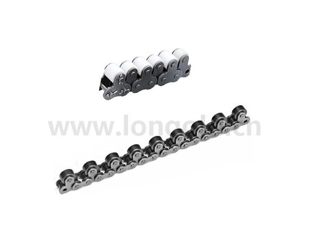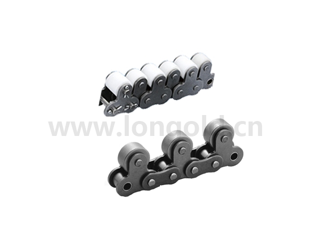 A系列短節距滾子鏈條的鏈板向上延伸,并在其上安裝可自行旋轉的頂置滾子的鏈條。鏈條的本體為鋼制,頂置滾子可選用鋼制或者工程塑料制。