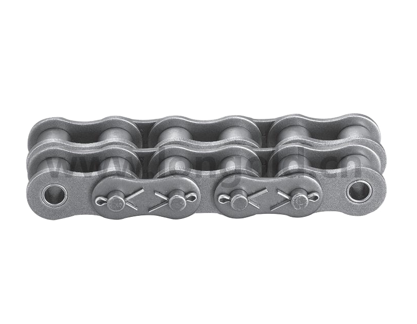 開口銷滾子鏈條,是指滾子鏈條每節連接處銷軸一端采用開口形式,用開口銷卡住以防外鏈片脫落。由于采用了開口銷結構,鏈條每節都可以方便拆卸更換,但其穩定性弱于鉚合型。