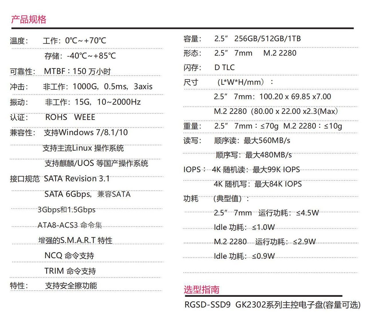 針對(duì)軍工系統(tǒng)特殊要求而設(shè)計(jì);SSD-JB系列 加固電子盤(pán);采用國(guó)內(nèi)首款真正國(guó) 產(chǎn)的化的固態(tài)硬盤(pán)控制芯片(國(guó)科微GK2302系列主控), 搭載龍芯嵌入式 CPU IP核,為我國(guó)信息安全保駕護(hù)航,集成國(guó)密加解密算法,安全可信。芯片采用 高速SATA 6Gbps接口與主機(jī)通訊,讀寫(xiě)速度達(dá)到500MB/s以上,可根據(jù)用戶需求 增加自毀、在結(jié)構(gòu)和接口類(lèi)型上,可根據(jù)用戶需求進(jìn)行結(jié)構(gòu);容量和接口的定制設(shè) 計(jì)。