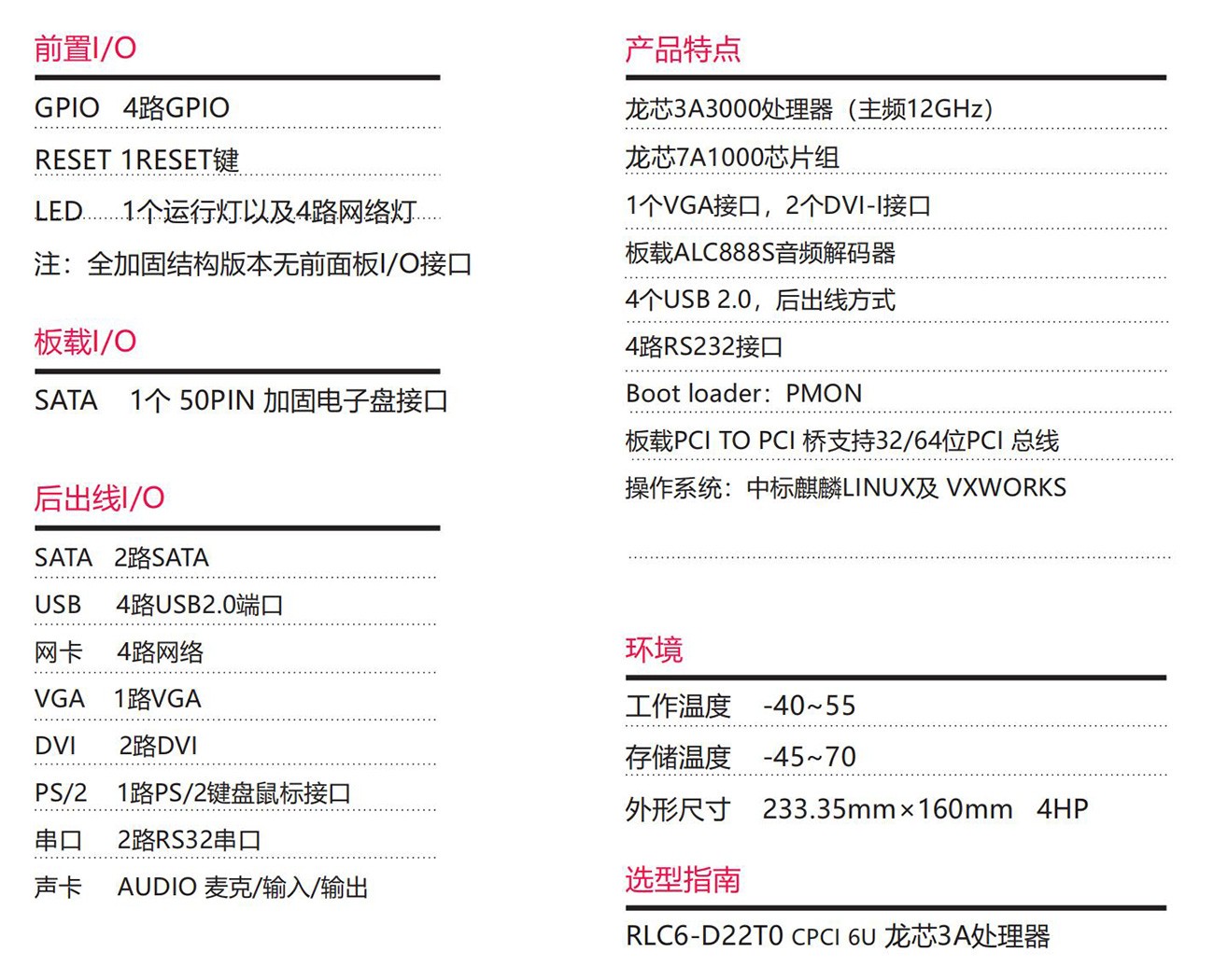 采 用 國 產 龍 芯 處 理 器 設 計 方 案 , CompactPCI 6U架 構 , 符 合 PICMG2.0 R3.0、PICMG2.16、PICMG2.3標準和海軍標主板標準。該產品具備優越的數據處理能力、圖形顯示能力、網絡通訊能 力、雷達和聲吶等應用對高速數據傳輸的要求。專為惡劣環境使用而設計,適用于對實時數據處理、通訊、自動化、軍工等領域。